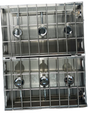 This folding stove is 26" wide, and has 6 burners. Burners are 9 1/2" apart. This stove is designed for use with our large stove stand for larger groups. 16 x 26 x 7 1/2. 29 lbs. All stoves come with a hose + regulator set.