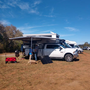 Stocked in two sizes: 8Ft & 9Ft. 6in., these sizes are the length of the awning backplate; no matter the length, the awning arms will project out a full 7-1/2Ft when open. This awning configuration features feature two pivot points and five arms. The BunduAwn 270 L-Shape will require a single pole which is now built into the awning design for storage. Like all BunduAwn products, it features a 19” downward slope for improved water run-off and gives you a large surface area of coverage + straightforward set-up. The BunduAwn 270 L-shape is a manual operation awning built with all-aluminum construction and aluminized RipStop fabric. All stock awnings are charcoal zipper cover with light gray awning material.