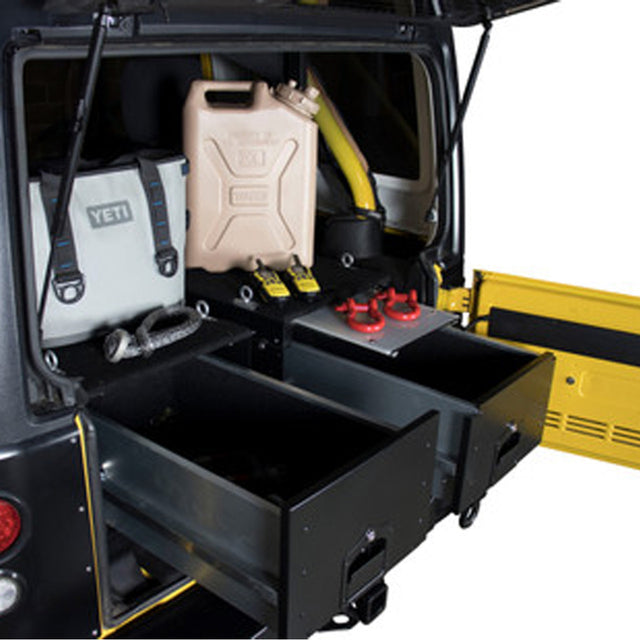 Overland Vehicle System’s Cargo Box with Slide Out Drawer & Work/Party station is the perfect solution for the organized aficionado that needs to have everything in place. Our system is perfect for single or stackable use and can be mounted to just about anything and features all marine grade qualities like hardware, fasteners, tie downs and carpet. Organize all your recovery gear, camping gear, cooking gear or dry goods. Our cargo boxes come with an oversized lockable paddle lock that ensure you gear stays locked up and keep it away from prying eyes. Ergonomically designed with the top being able to slide in and out for access to expand the work area, get access to the back of the box as well as easier to secure your load with the included forged ring tie downs. OVS brings you high quality overland gear to meet the needs for any adventure.