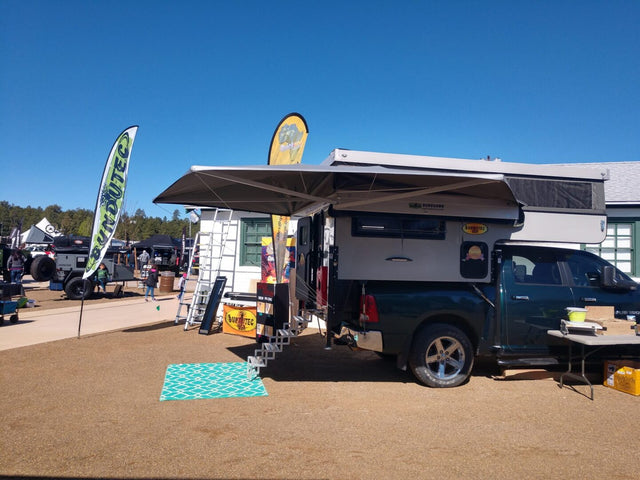 Only Available in the 8Ft Length, this is a Right Hand Side mount and perfect for pop-top truck campers. Just like the other Bundutec awnings, the arms when open will project out a full 7-1/2Ft. This awning configuration features one pivot point and four arms. The 90-degree BunduHalf is fully self-supported and features a 19” downward slope for improved water run-off. It gives you a large surface area of coverage + a straightforward set-up. The 90-degree BunduHalf is a manual operation awning built with all-aluminum construction and aluminized RipStop fabric. All stock awnings are charcoal zipper covers with light gray awning material.