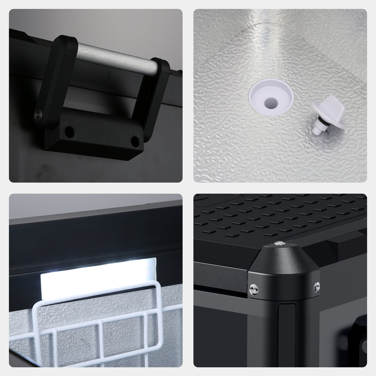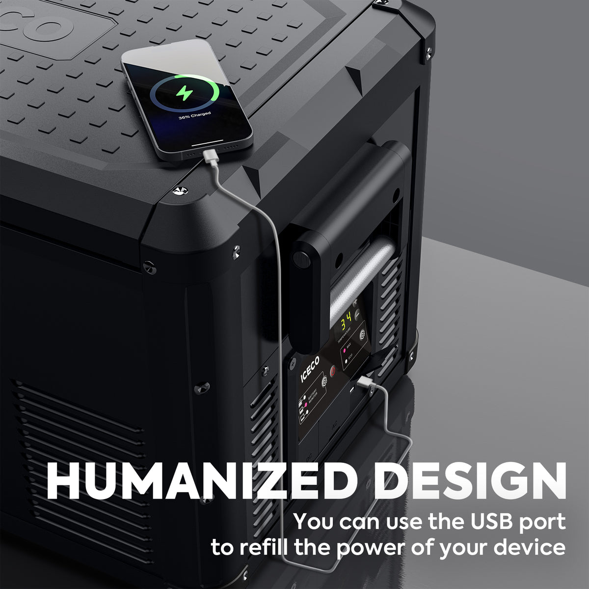 Humanized Design: Weatherproof control panel; Easy to clean the refrigerator box with drain hole. Internal Led Light; Max&Eco Mode; 3 Battery Protection Level.